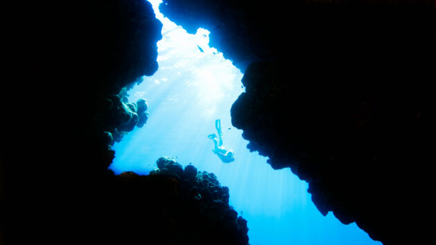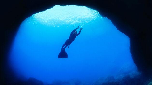 Freediver with monofin, exploring Blue Gap, Gozo, Malta. Photograph: Blue Planet Archive LLC / Alamy.
