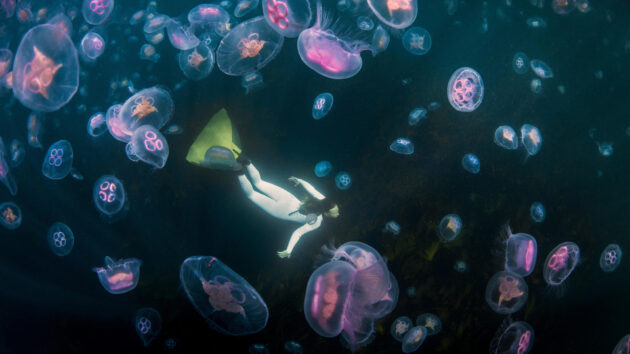Free diver with monofin, surrounded by moon jellyfish. Photograph: Join Photos / Alamy.