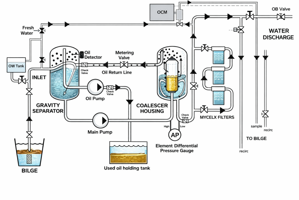 Most marine OWS designs begin with some form of gravity separation, allowing free oil to rise and be skimmed into a sludge or waste oil tank. Because gravity separation alone is insufficient to meet discharge limits, additional stages are added. These commonly include filters and coalescer elements designed to break surface tension between oil droplets, encouraging them to merge into larger droplets that can separate under buoyancy forces.