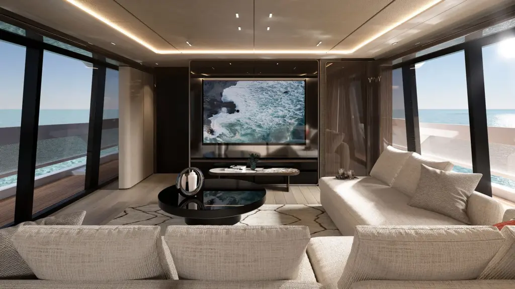On the stern, the yacht employs a “twin‑mode transom” storage system that mixes a floodable storage, submersible platform and seaside space right into a single built-in resolution. The foredeck spans roughly 25 sq. metres and is organized as a versatile seating space with a Jacuzzi, providing an alternate ahead social zone. These techniques improve seaside membership performance and water‑toy deployment with out sacrificing on‑deck lodging or circulation.