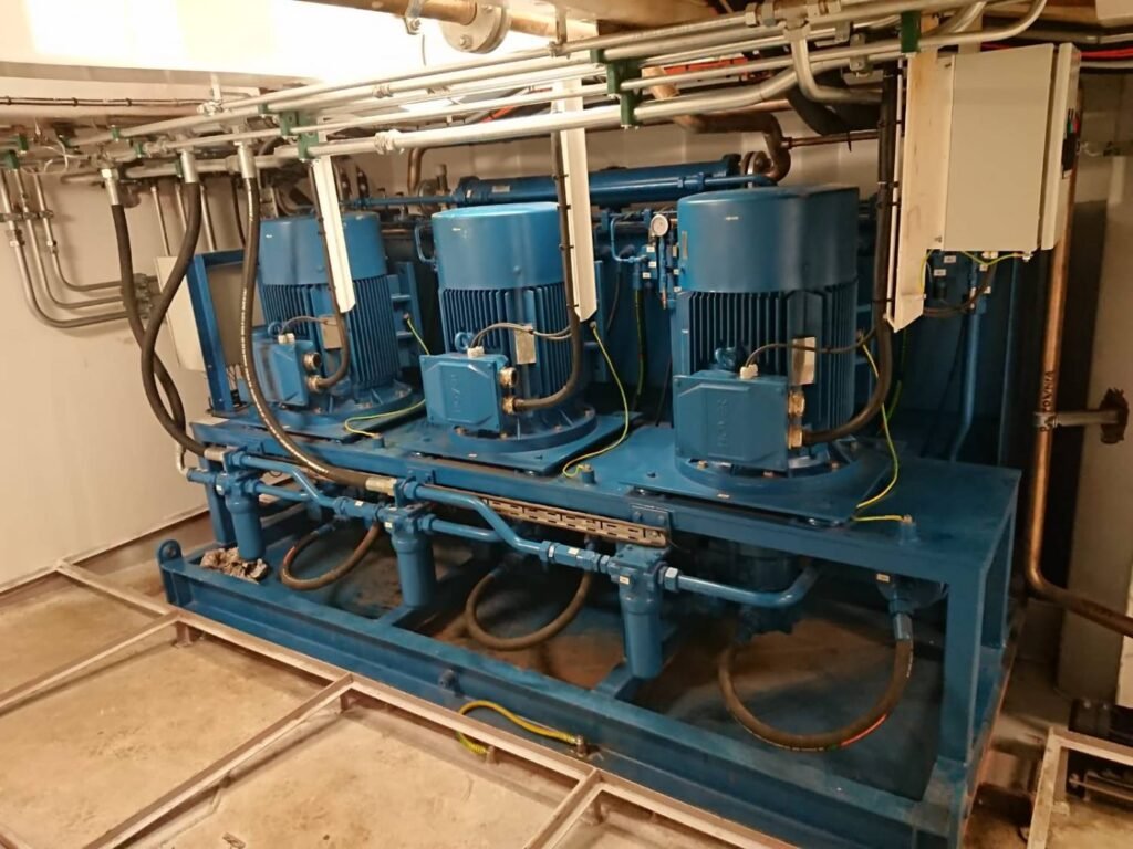 Power generation systems supply electrical energy to deck equipment, often under high transient load. Air compressors provide starting air, control air, and service air, with deck operations frequently imposing rapid demand changes. Pumps move fuel, cooling water, bilge water, ballast, and cargo fluids, linking deck activity directly to internal machinery spaces.