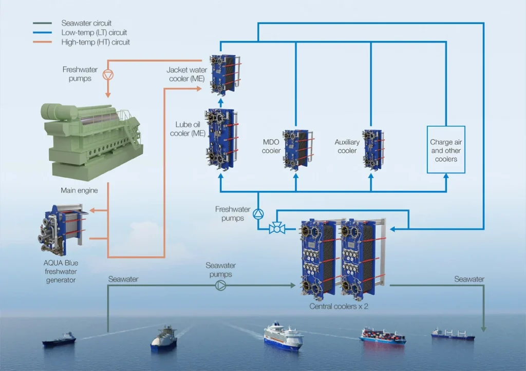 Modern ships overwhelmingly adopt central cooling architectures. In this arrangement, seawater is confined to a single boundary loop, typically circulating only through central coolers. Heat is transferred from freshwater systems—HT jacket water, LT circuits, lubricating oil—via heat exchangers.